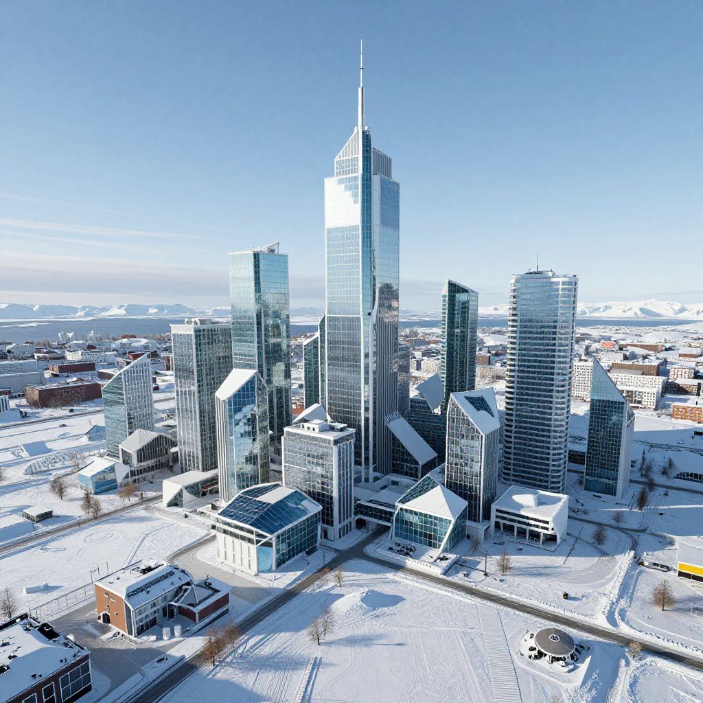 Photograph of a winter cityscape featuring a cluster of modern skyscrapers with glass facades, partially covered in snow. The tallest building, with a pointed spire, stands prominently in the center. Surrounding buildings vary in height and design, with some featuring angular and others rectangular shapes. The ground is blanketed in snow, and clear blue sky contrasts with the white landscape. Roads and smaller buildings are visible in the foreground, while the distant horizon reveals more urban structures and a frozen body of water. The image is brightly lit with high contrast.