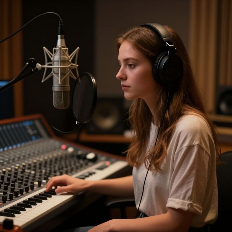 4K Resolution girl in music studio, recording studio, musical instruments, microphone, mixing console, warm lighting, cinematic footage, hyper-realistic, realistic, real, high detail 8K,