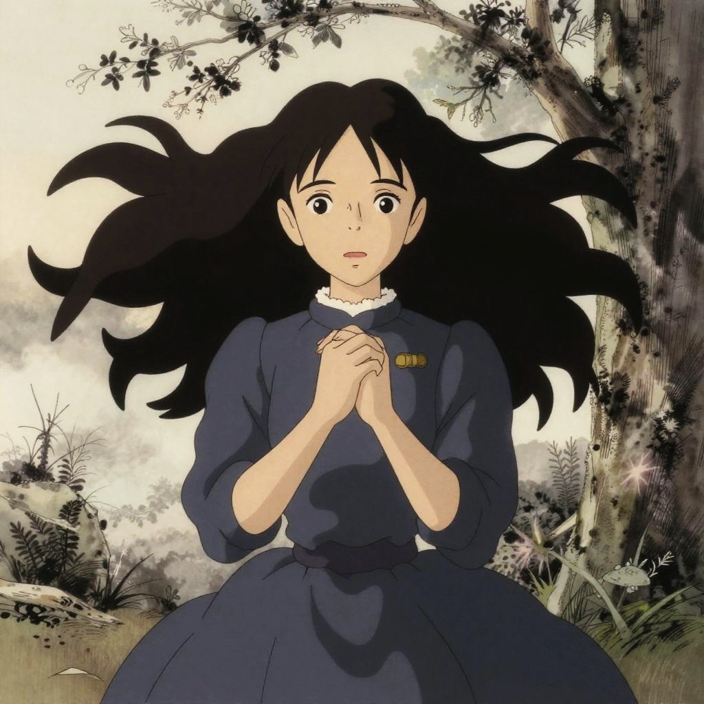 Realistic photo.heroine of Sleepy Hollow, magical fantasy art in ink, crucial animation, with whispering winds, inspired by Hayao Miyazaki, mood: nostalgic realistic photo
