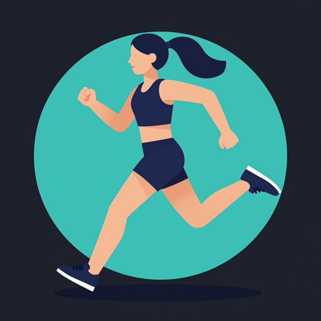 Digital illustration of a fit woman with black ponytail, wearing a sports bra and shorts, running against a turquoise circle.