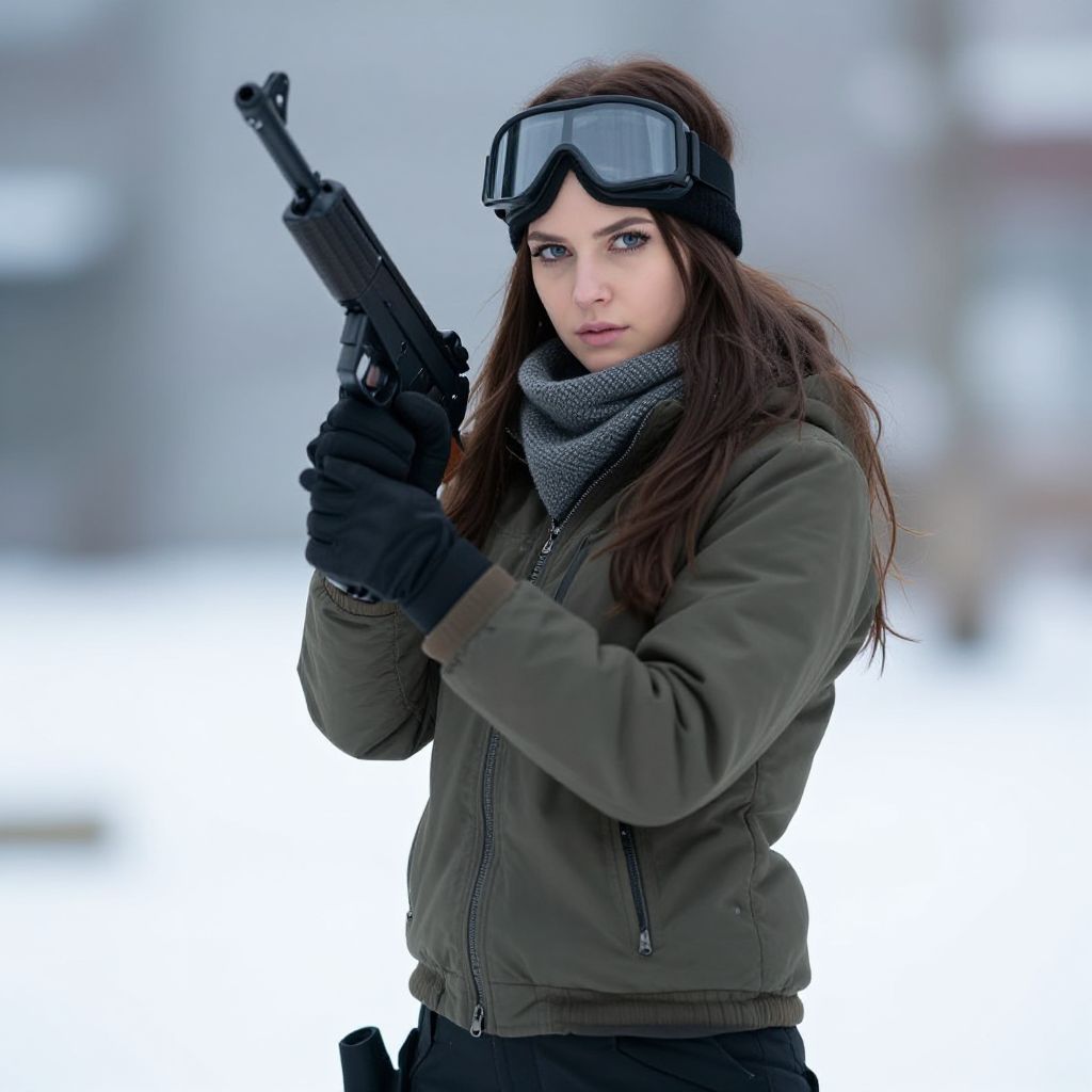 "female winter soldier, 1girl, solo, gun, weapon, goggles, gloves, scarf, goggles on head, blurry, long hair, blurry background, holding, black gloves, brown hair, looking at viewer, submachine gun, jacket, holding weapon, snow, blue eyes, pants Realistic photo of casual sexy person with pretty face"
