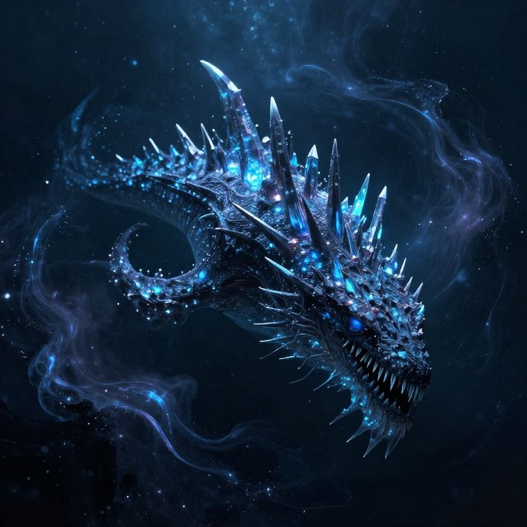 A dark, cosmic leviathan creature featuring sharp, glowing crystalline spikes protruding along its body. The bioluminescent deep-sea monster emits ethereal blue light and is surrounded by swirling nebula clouds and misty tendrils, blending alien and mythological design elements to create an intense, mysterious atmosphere.