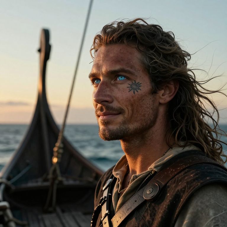 Envision a captivating photorealistic portrait of a Hispanic explorer with piercing ice-blue eyes and sun-kissed skin adorned with subtle freckles and a smiling sun tattoo beneath their left eye. Standing at the prow of an ancient Viking longship, they gaze pensively into the unforgiving ocean. Soft golden light from a setting sun illuminates their rugged features, casting dramatic shadows that accentuate their weathered face and wind-tousled hair. This emotionally charged portrait seamlessly blends adventure, introspection, and ancient wisdom, inviting viewers to embark on an exploration of this intrepid soul's journey through their captivating gaze.