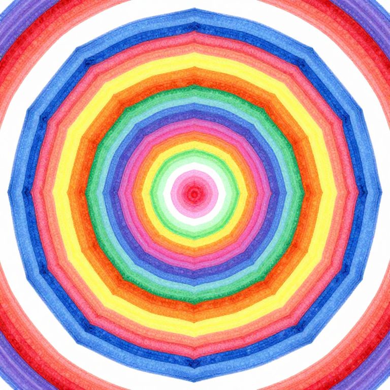 Vibrant, colorful, concentric circle drawing with rainbow hues of red, orange, yellow, green, blue, and purple on a white background