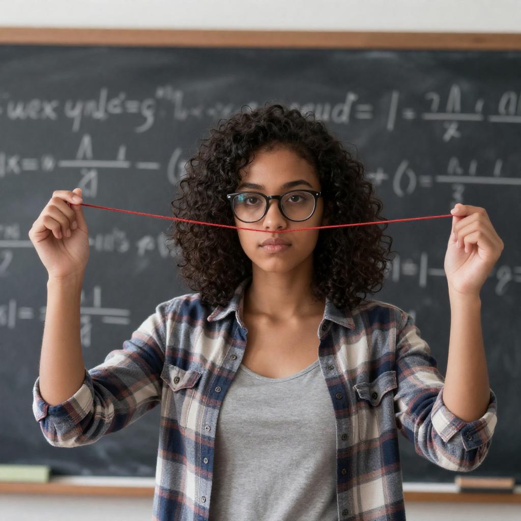 Photograph of a man standing in front of a blackboard filled with complex mathematical equations. He wears glasses, a brown tweed jacket, white shirt, and blue striped tie. His hands rest at his sides, head slightly tilted upward. Chalkboard background with various mathematical notations and graphs. Wooden desk at bottom. Man has short dark hair, medium build, and light skin.