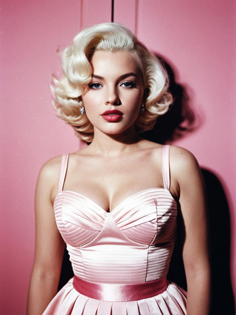 Woman in Marilyn Monroe Pink Costume, waist-up editorial portrait, photorealistic tones