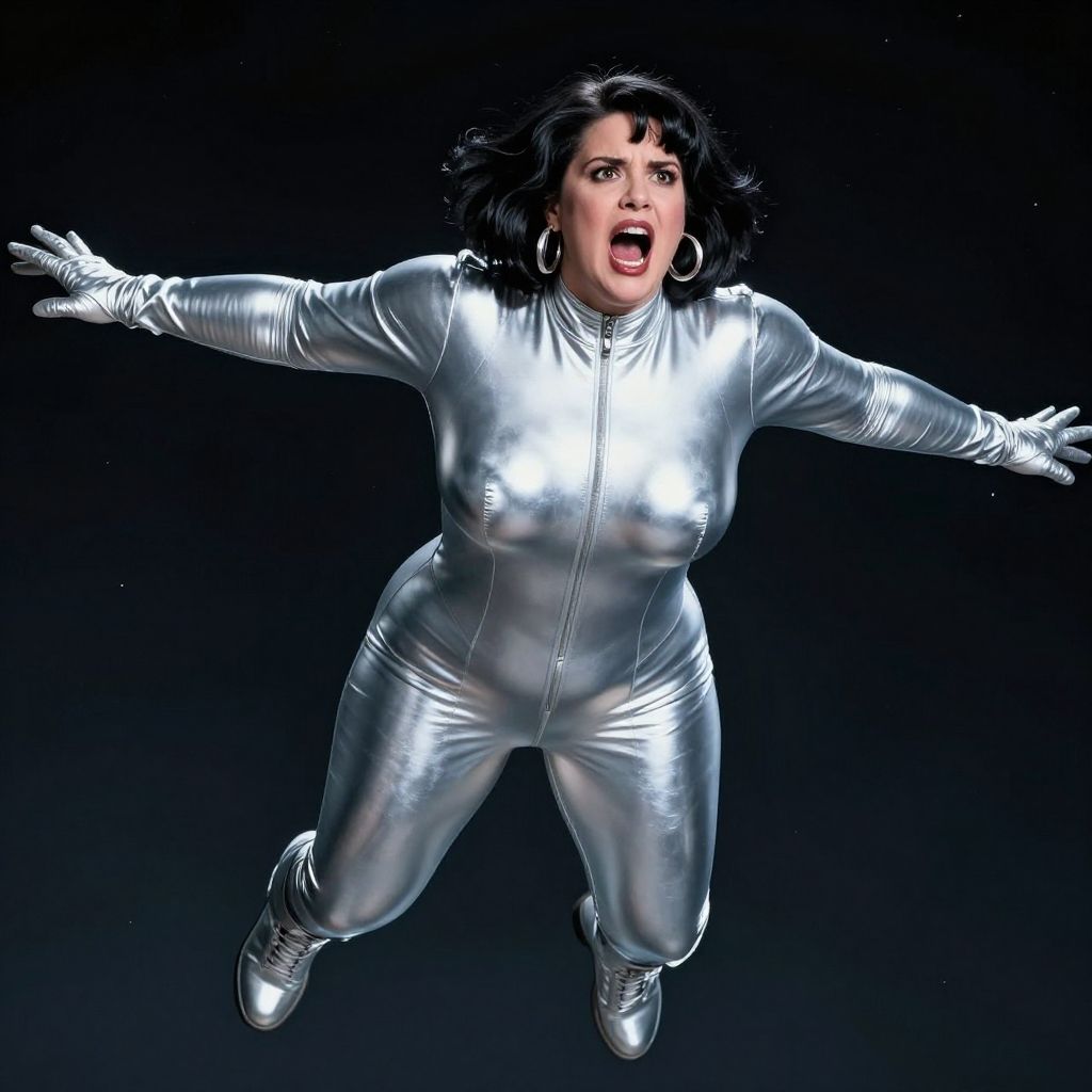 Digital artwork of a shocked woman with black hair, wearing a shiny silver jumpsuit and gloves, mid-leap against a black background. Her mouth is