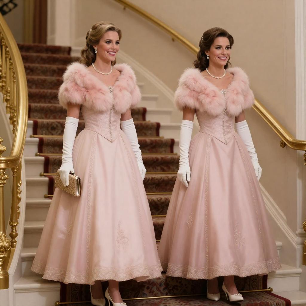 Two women in ornate pink ball gowns with fur shawls, white gloves, and pearls, descending a grand, gold-railed staircase. The woman on the left holds a gold clutch, both smiling. Curled brown hair, elegant setting. Richly patterned carpet.