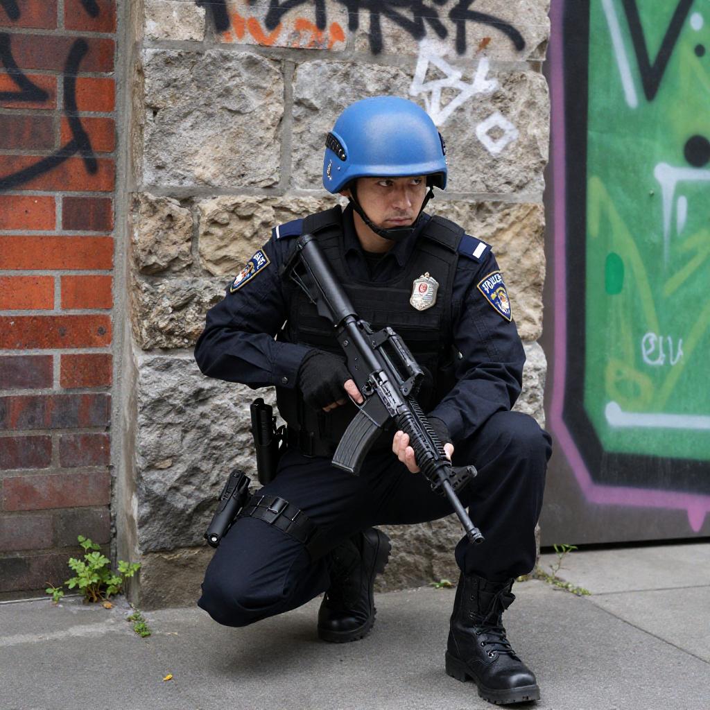Male police officer in blue helmet, black uniform, and vest, holding a black assault rifle, crouching in a graffiti-covered, worn brick alleyway. Intense expression, stone wall in background, green painted wall on the right.