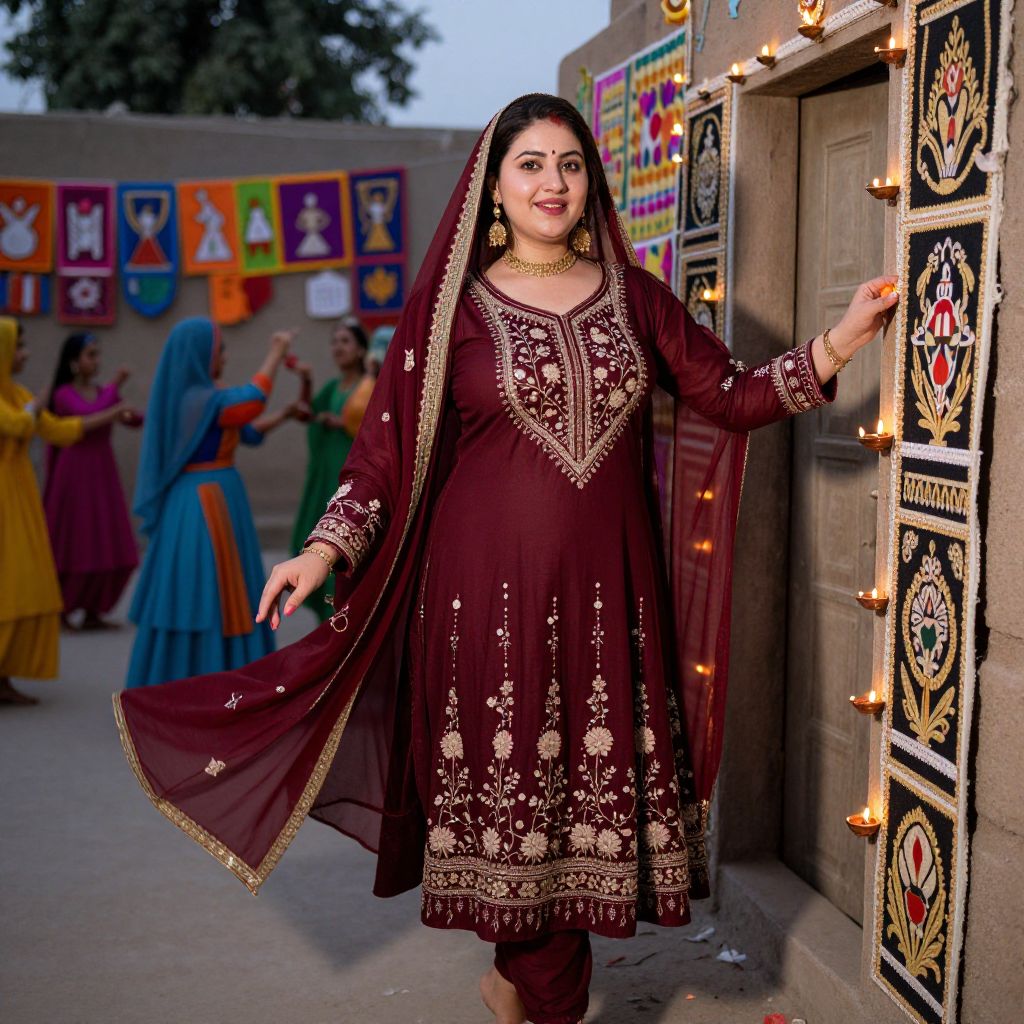 A dynamic portrait of a pathani salwar suit woman celebrating a festival in a rural village near Tharparkar, Pakistan, with a colorful background of folk dancers and hand-painted banners; she has fair skin, sharp cheekbones, and a joyful expression, wearing a deep maroon pathani salwar suit with floral patterns and a matching dupatta, standing beside a decorated door with oil lamps lit in the evening.. The woman has big tits and cute face