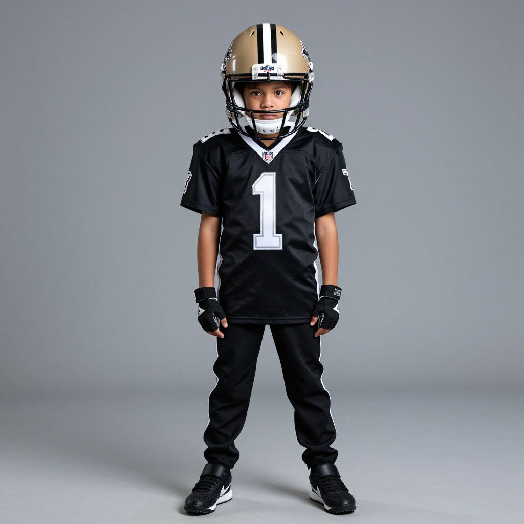 Nfl saints uniform kid, 1boy, solo, helmet, male focus, full body, black footwear, gloves, standing, pants, fingerless gloves, looking at viewer, shirt, grey background, simple background, black pants, short sleeves, black shirt, black gloves, black hair, shoes
