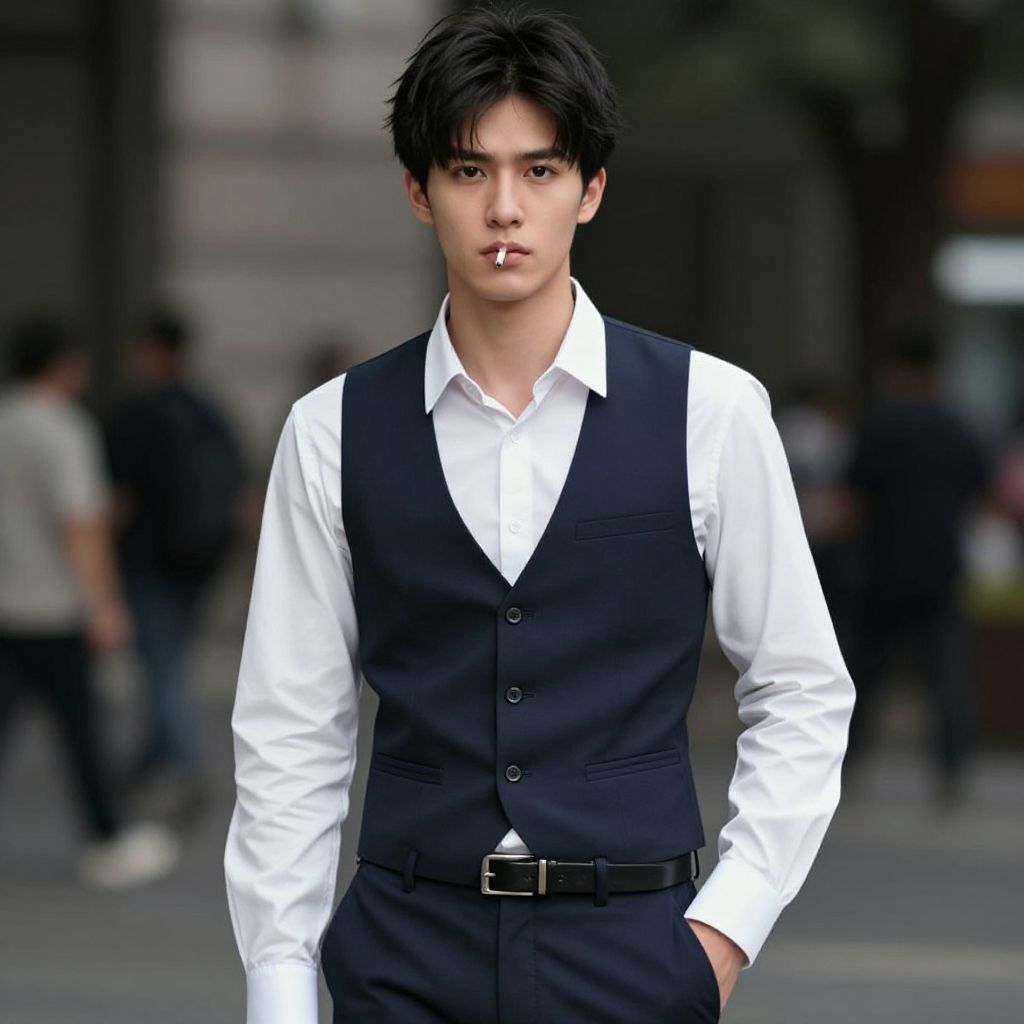 "shirt stylish costume, 1boy, male focus, solo, shirt, hand in pocket, belt, black hair, vest, white shirt, pants, blurry, blurry background, collared shirt, cigarette, realistic, long sleeves, looking at viewer Realistic photo of casual sexy person with pretty face"