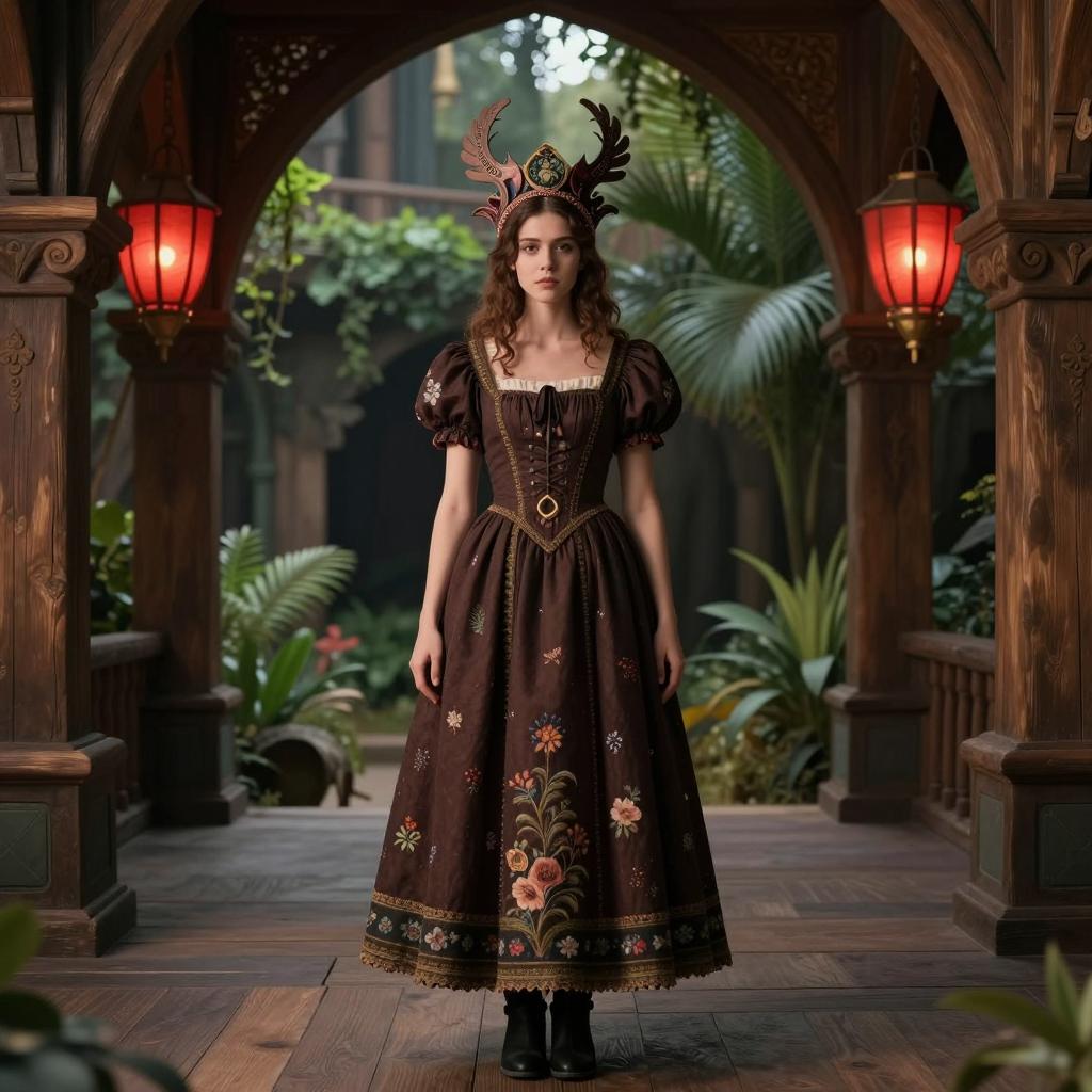 Disney dress tower terror, photorealistic, young woman, standing, medieval fantasy, intricate headdress, dark brown dress with floral patterns, puffed short sleeves, belted waist, black boots, ornate background, wooden arches, red lantern, lush green plant, soft natural light, detailed ures, wooden floor, fantasy setting, mysterious atmosphere, realistic lighting, centered composition