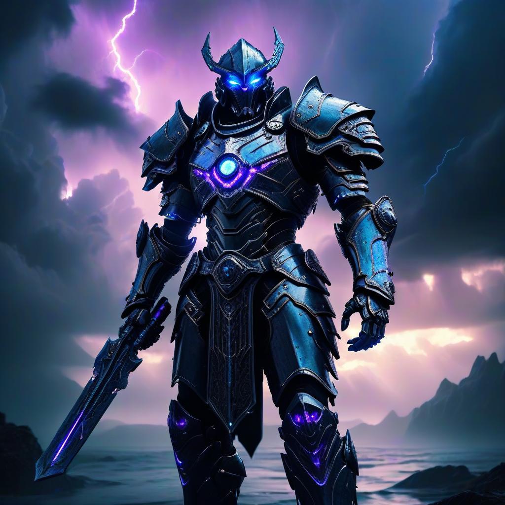 A dark fantasy armored warrior with cybernetic details glowing with purple and blue light, intense glowing eyes and energy in hand, standing in a stormy, mystical environment with dramatic clouds and moody lighting, highly detailed armor with futuristic and medieval elements, epic and powerful atmosphere