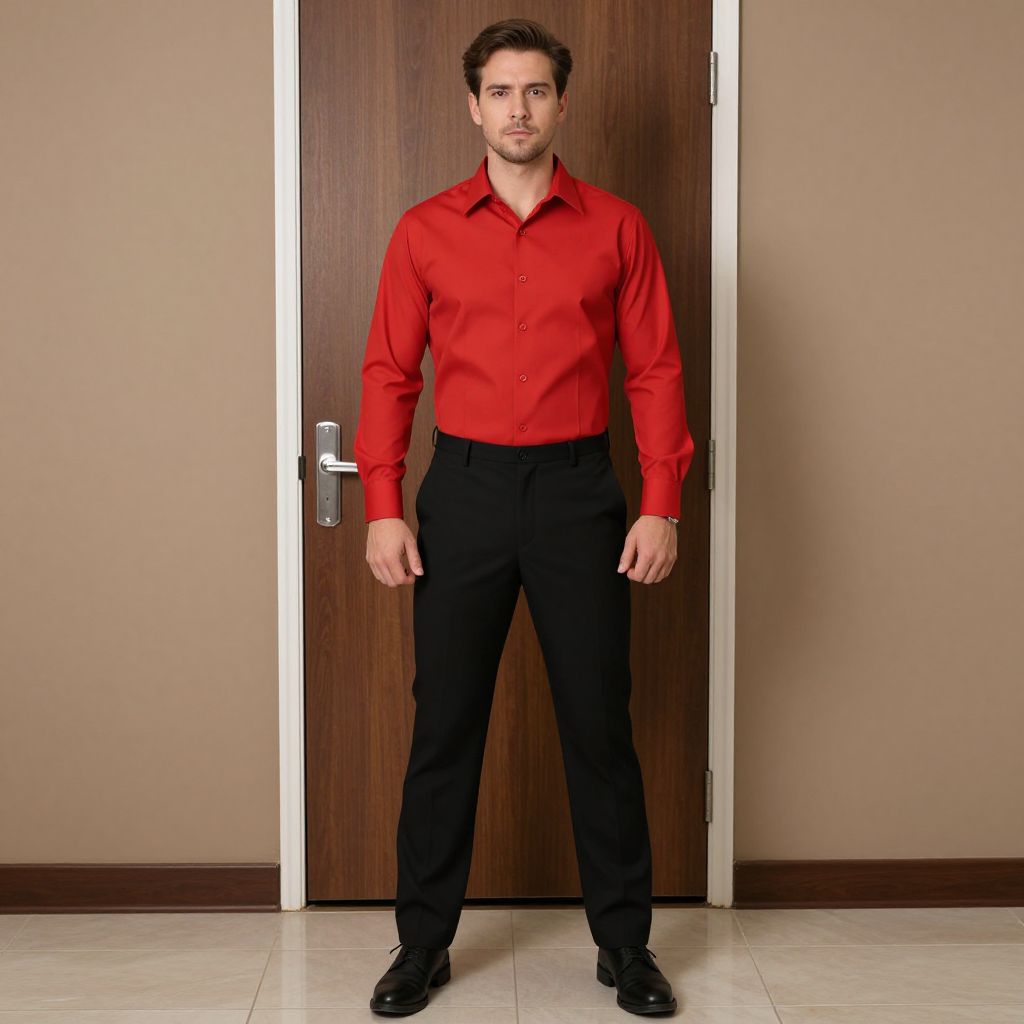 Photograph of a young man standing in front of a wooden door with a metallic handle. He has short, dark brown hair, a trimmed beard, and is looking directly at the camera with a neutral expression. He wears a bright red, long-sleeved, button-up shirt, black dress pants, and black leather shoes. The background features a beige wall and a white-tiled floor. The lighting is even, highlighting his formal attire and the simplicity of the setting.