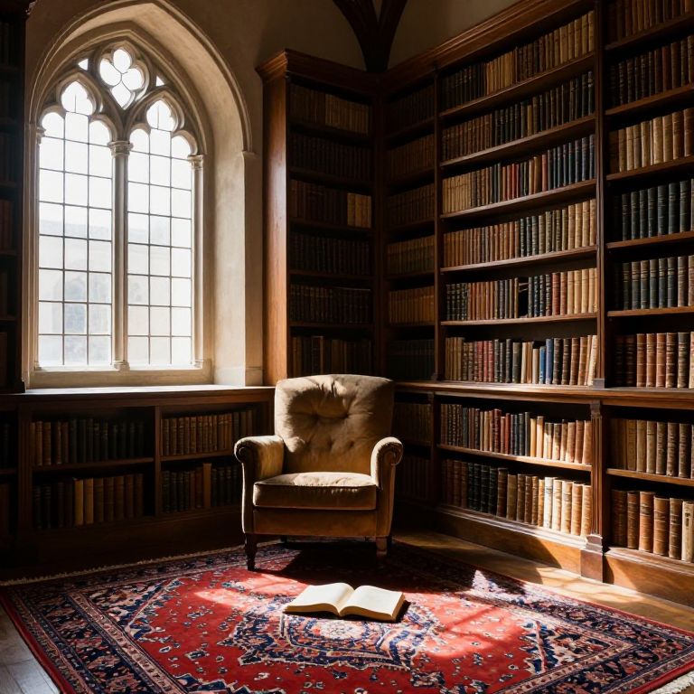 Photograph of a dimly lit, cozy library room with tall, arched windows allowing sunlight to stream in. A beige, tufted armchair sits on a rich, red Persian-style rug with intricate patterns. Shelves filled with neatly arranged books line the walls, creating a warm, scholarly atmosphere. A single open book rests on the rug in front of the chair. The wood-paneled walls and high ceilings add to the classic, intellectual ambiance.