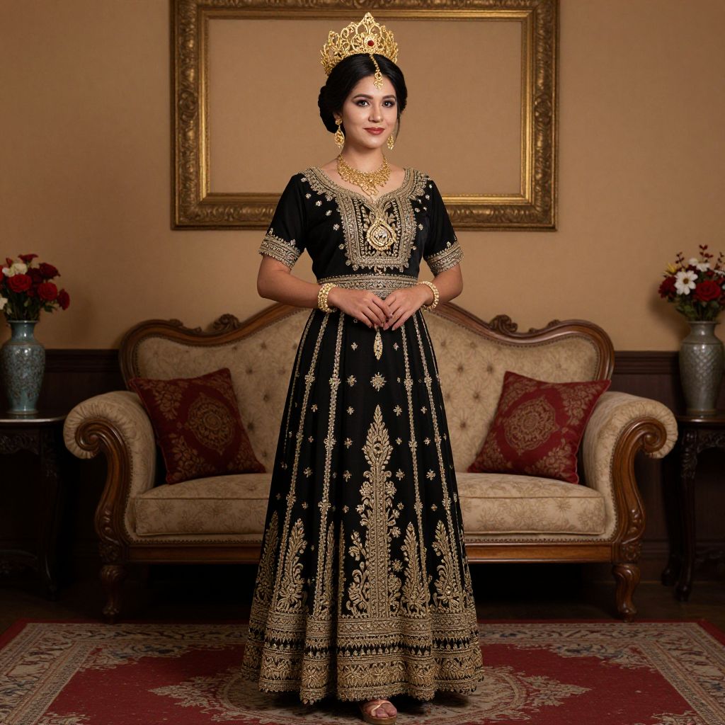 Photograph of a South Asian woman in an ornate black and gold traditional dress, gold jewelry, and crown, standing in an elegant, warmly lit