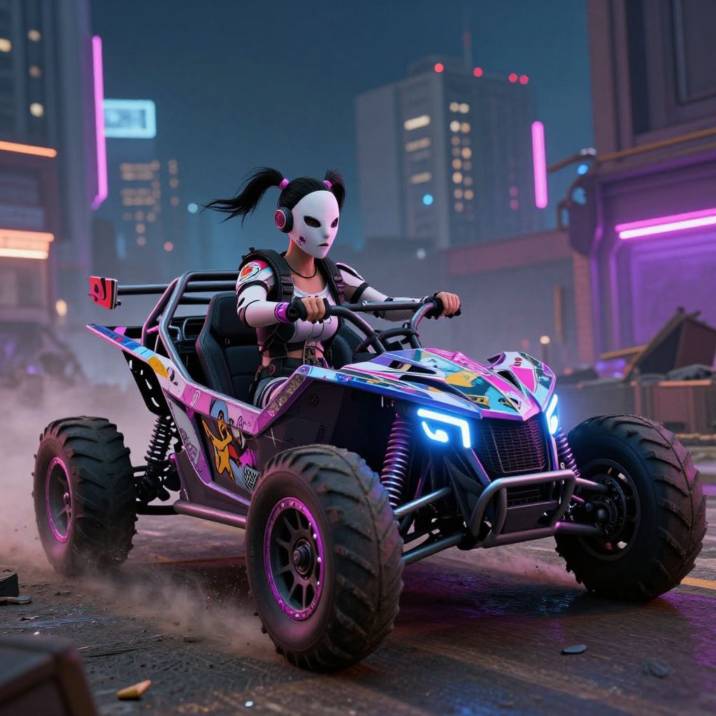 A hyper-realistic, neon-lit post-apocalyptic scene featuring a woman in a mask and pigtails driving a heavily customized, zombie-slaying dirt buggy through a desolate cityscape.