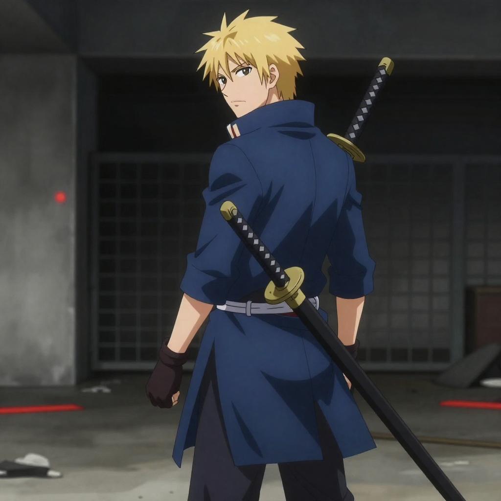 Anime-style illustration of a male character with spiky blonde hair, wearing a blue coat, brown gloves, and carrying a sword on his back. He stands in a dimly lit, fenced, concrete area with red lights and debris on the ground. He looks over his shoulder with a serious expression. His right hand is slightly raised. A wooden katana is sheathed on his left side.