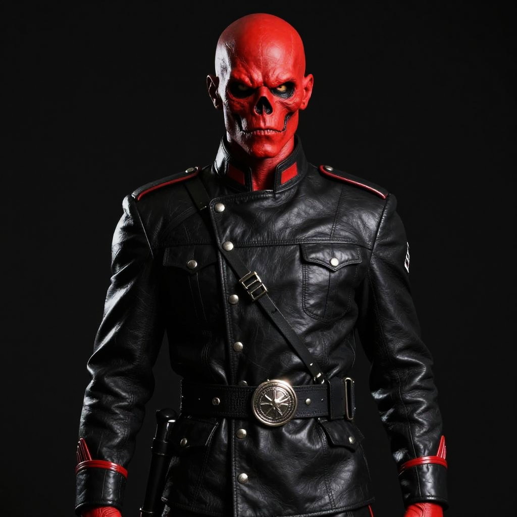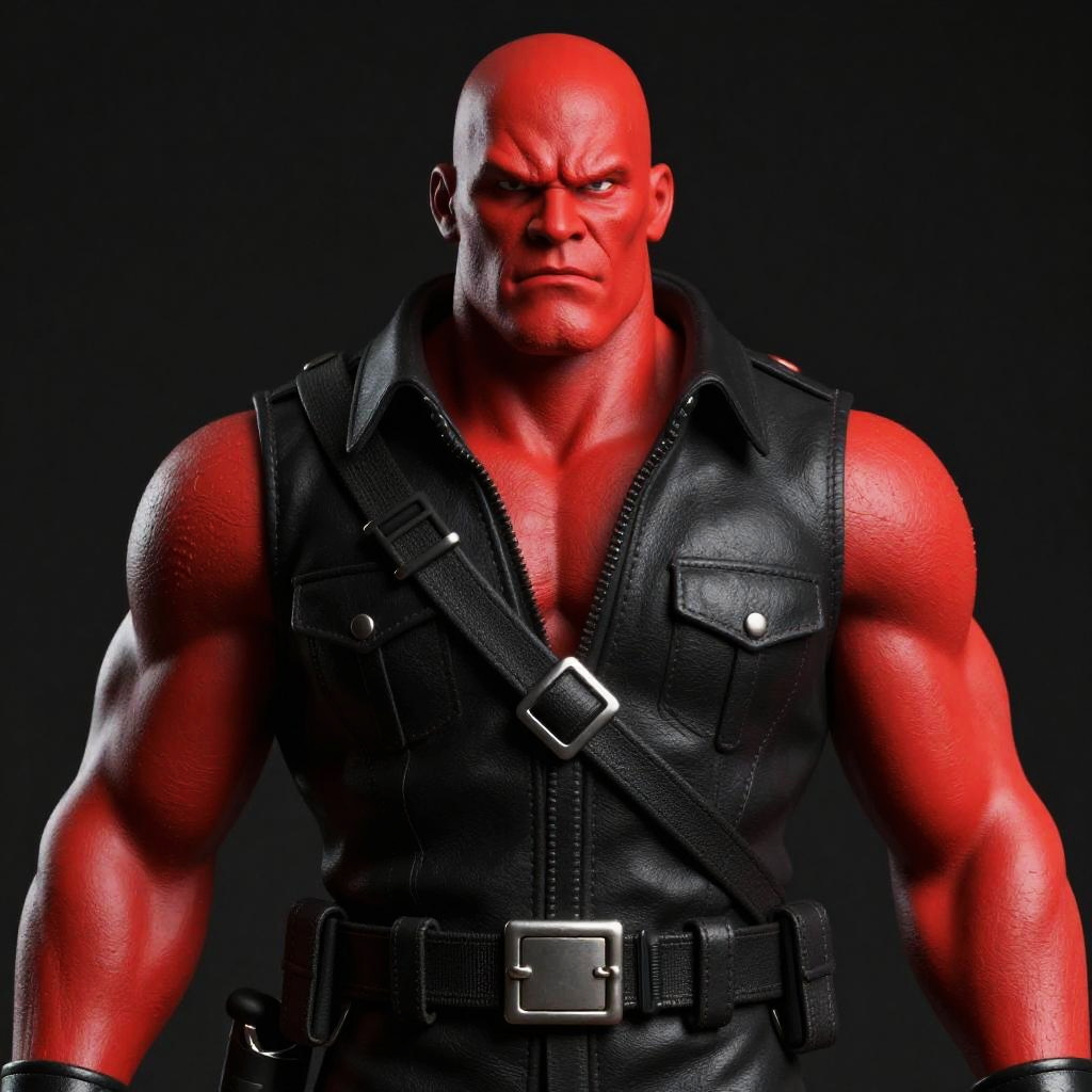 Photograph of a red-skinned, bald male character with a muscular build, wearing a black, military-style uniform with multiple straps and a silver belt buckle. His face is stern, with visible wrinkles and a slightly menacing expression. The background is solid black, making the character's vibrant red skin stand out. The uniform has a glossy texture, contrasting with the matte red skin.