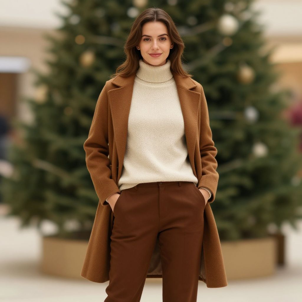 Eve winter outfit, 1girl, solo, sweater, christmas tree, brown pants, coat, blurry background, looking at viewer, pants, hands in pockets, blurry, christmas, smile, turtleneck sweater, turtleneck, realistic, brown coat, brown hair, standing