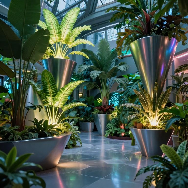Planters in a futuristic indoor garden, sleek metallic containers shaped in angular forms, exotic plants with glowing leaves under soft neon lighting, ultra-modern interior with a touch of nature, glossy surfaces reflecting ambient light, surreal and imaginative environment.