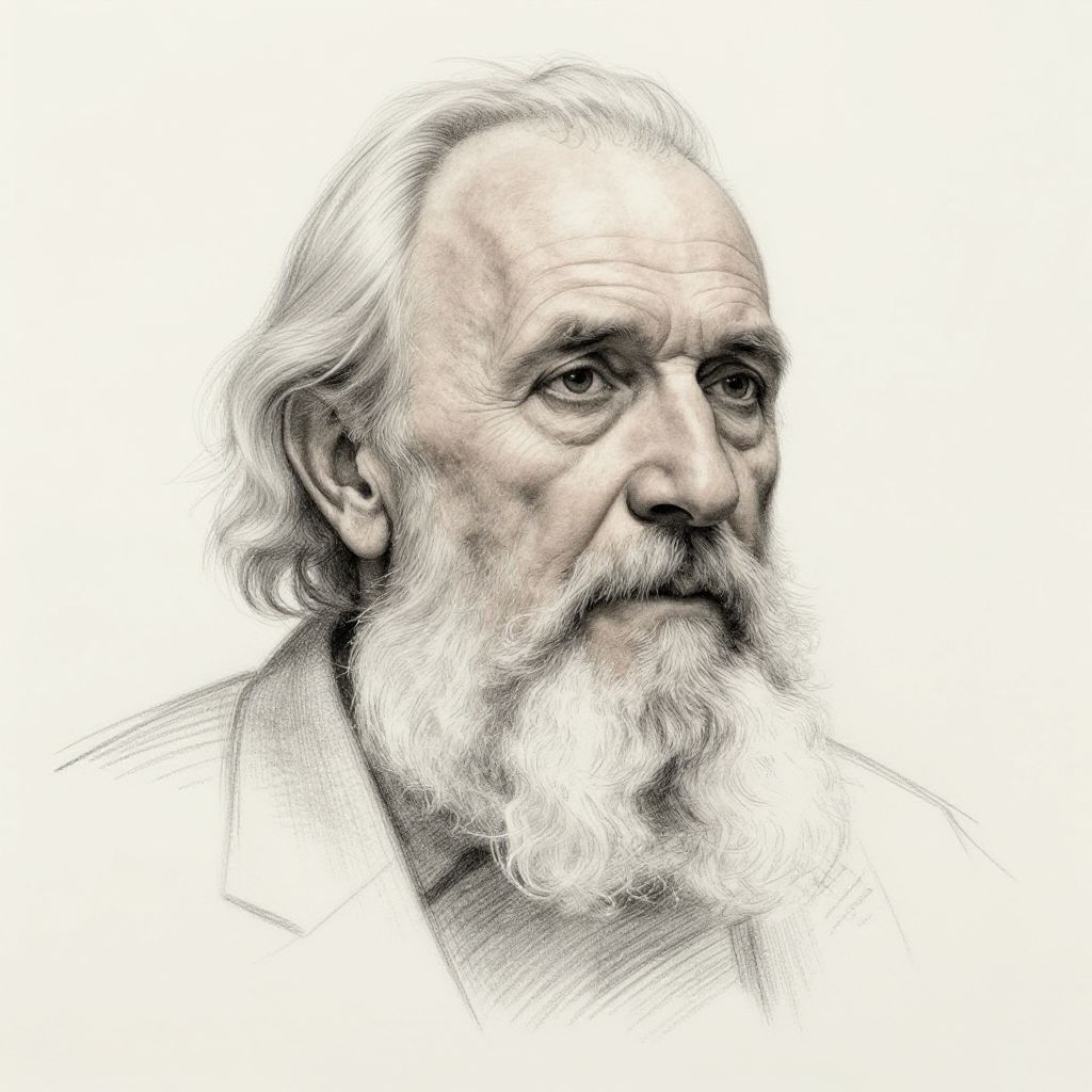 Detailed, realistic digital drawing of an elderly man with white hair, a long white beard, and a thoughtful expression, set against a white background.