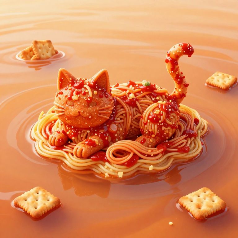 A cat-shaped island floats peacefully atop a lukewarm sea of spaghetti sauce, complete with tiny maus crackers as islands in the surrounding broth.
