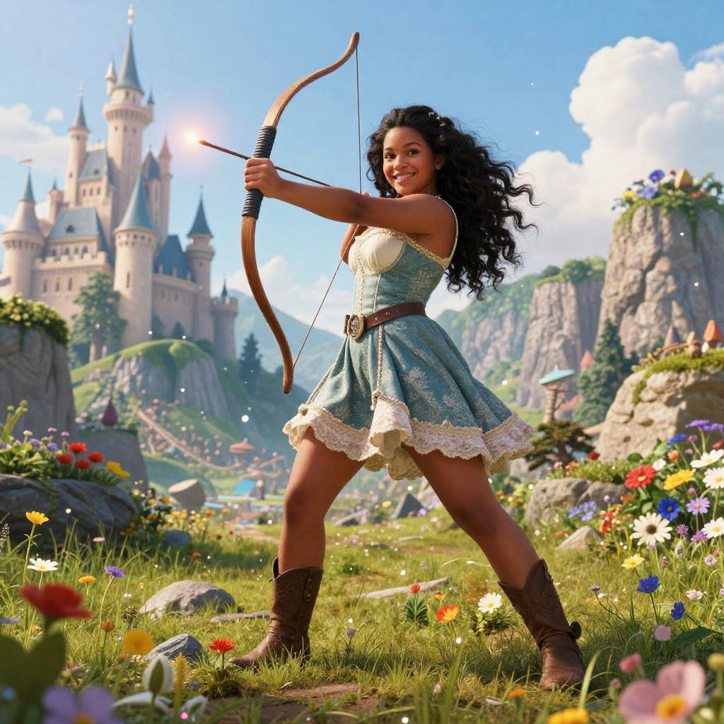 Photorealistic digital art: Dark-haired woman with curly hair, wearing blue dress, brown boots, and bow, stands in vibrant meadow, aiming