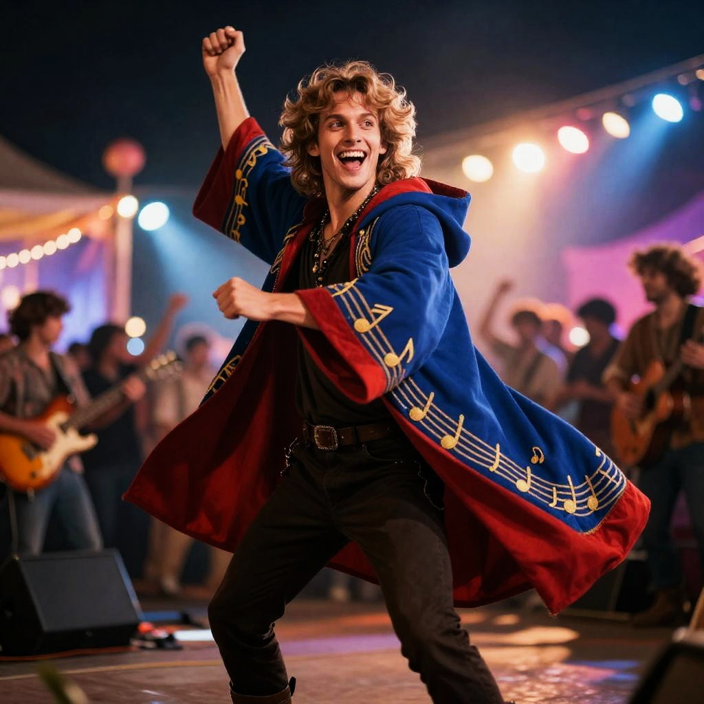 Realistic photo.A effervescent bard in a dynamic pose, wearing a flamboyant cloak embroidered with musical notes, with a vibrant festival bursting with lights and music, in the vibrant comic art style of Amanda Conner. realistic photo