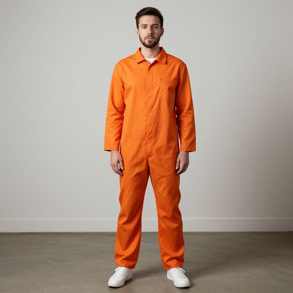 Orange inmate costume, 1boy, male focus, solo, orange jumpsuit, shoes, facial hair, full body, sneakers, standing, jumpsuit