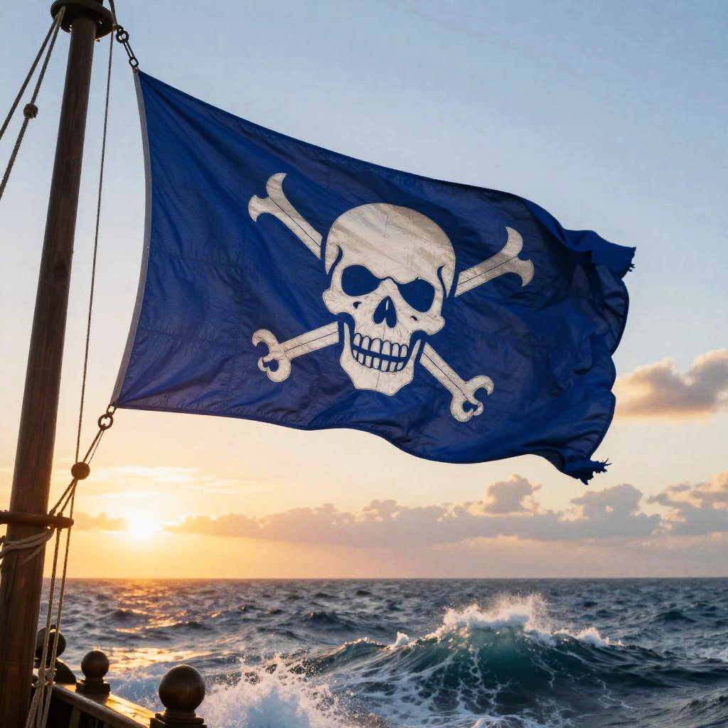 Dynamic scene of a pirate crew aboard a ship, a bright blue pirate flag prominently displayed, fluttering dramatically in the ocean breeze, pirate skull emblem with intricate patterns, dusk lighting emphasizing the flag's rich blue color, high detail