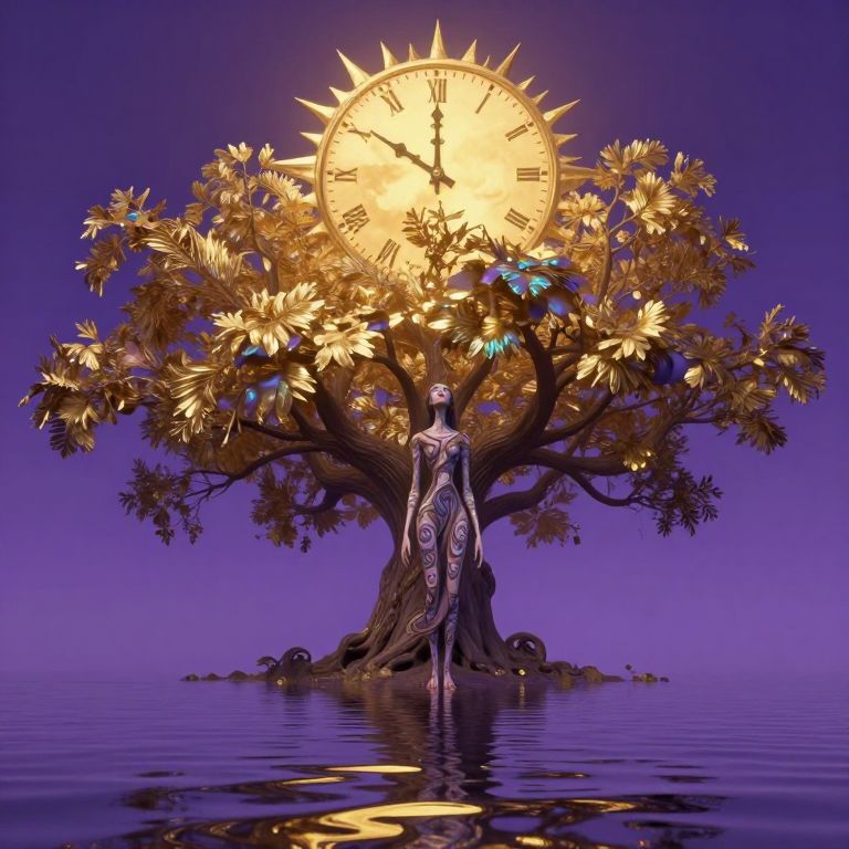 A digital CGI artwork depicts a stylized, humanoid figure standing in front of a large, glowing, golden clock tree with radiant sun-like rays. The figure, with intricate, swirling patterns on its body, stands in a reflective, purple-hued water surface. The tree's leaves are illuminated, casting a warm, golden light. The background is a gradient of deep purple to lighter purple, enhancing the ethereal, otherworldly atmosphere. The figure's pose is serene, with one arm slightly raised, and the tree's roots extend into the water. The overall style is surreal and mystical, with a strong emphasis on light, texture, and symmetry.