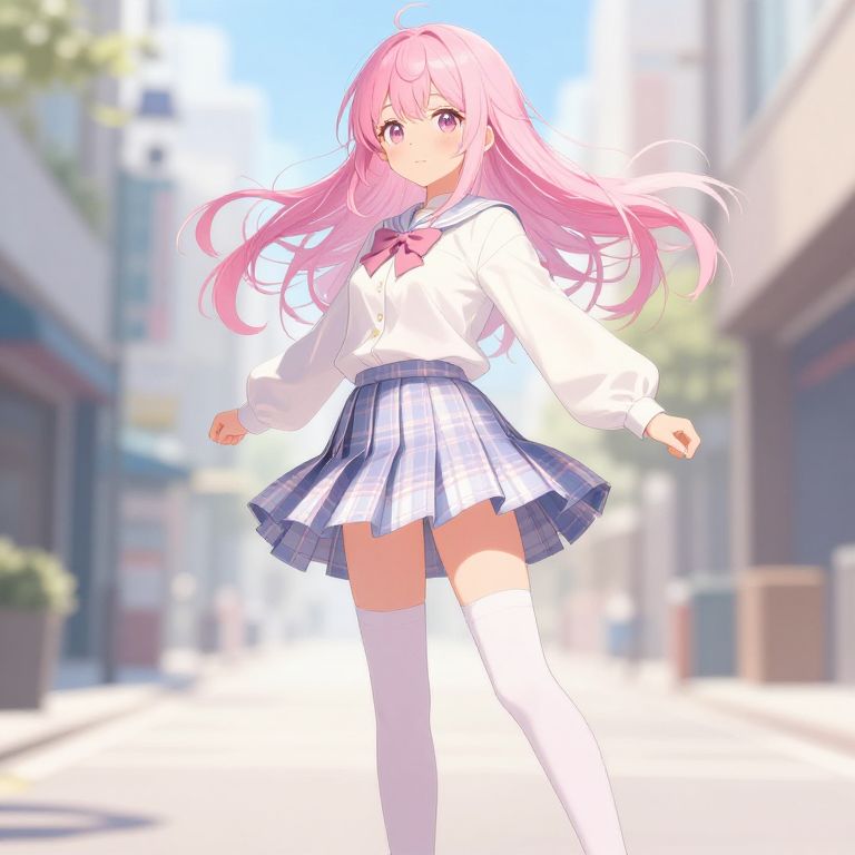 Thigh high socks anime girl standing in a sunlit city street, vibrant pastel colors, detailed hair flowing in the breeze, expressive eyes, wearing a school uniform with plaid skirt, high resolution, dynamic pose, soft shading and lighting