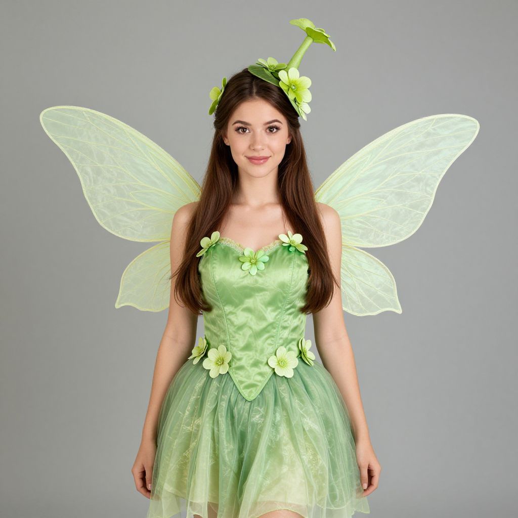 Adult fairy costume green, 1girl, solo, wings, hat, dress, flower, green dress, brown hair, hat flower, looking at viewer, long hair, fairy wings, realistic, fairy, lips, bare shoulders, smile