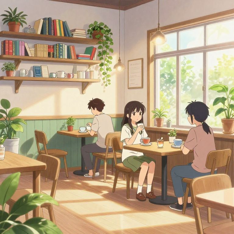 Cafe background anime scene, cozy and vibrant interior with warm lighting, wooden tables, shelves filled with books and plants, soft pastel colors, characters enjoying coffee, hand-drawn style with detailed textures and gentle sunlight streaming through large windows.