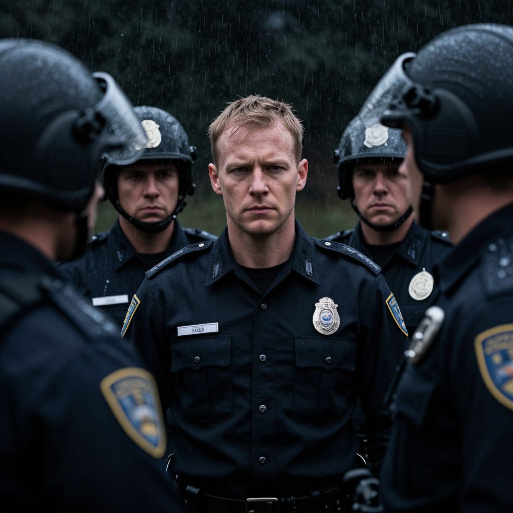 The image depicts a dramatic scene with a central figure, a man with light-colored hair, dressed in a dark uniform with a badge and a name tag, standing in front of a group of police officers. The officers are wearing helmets with visors, and their uniforms are dark, with visible patches and insignias. The background is dark and moody, with raindrops visible, adding to the intensity of the scene. The man's expression is serious and contemplative, suggesting a moment of decision or reflection. The overall composition is tightly framed, focusing on the interaction between the man and the police officers, creating a sense of tension and authority. The use of dark colors and the wet, rainy atmosphere contribute to a somber and dramatic mood.