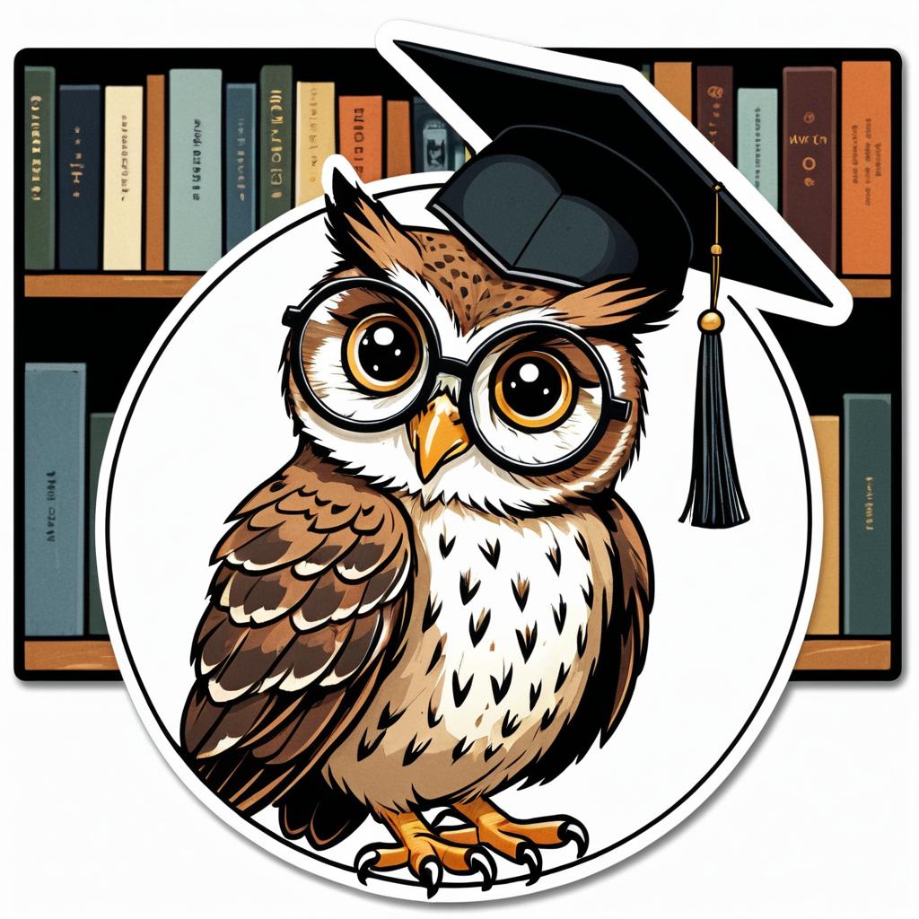 A digital drawing cartoon sticker of a gray tabby cat wearing a wizard hat and scarf, in an enchanted forest, styled with striped fur, green eyes, tufted ears, black border, white background, whimsical and playful mood