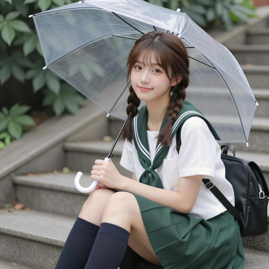 Asian girl with fair skin, dark brown hair in a side ponytail, wearing a black Japanese school uniform with white necktie, kneeling. Holding a red paper umbrella with gold patterns behind her. Black pleated skirt, white sleeves with detailed designs. Intense gaze, red lipstick. Concrete floor background. Umbrella handle in right hand, left hand on knee. Black hairpins in hair. Black shoes with white stripes. Natural light.