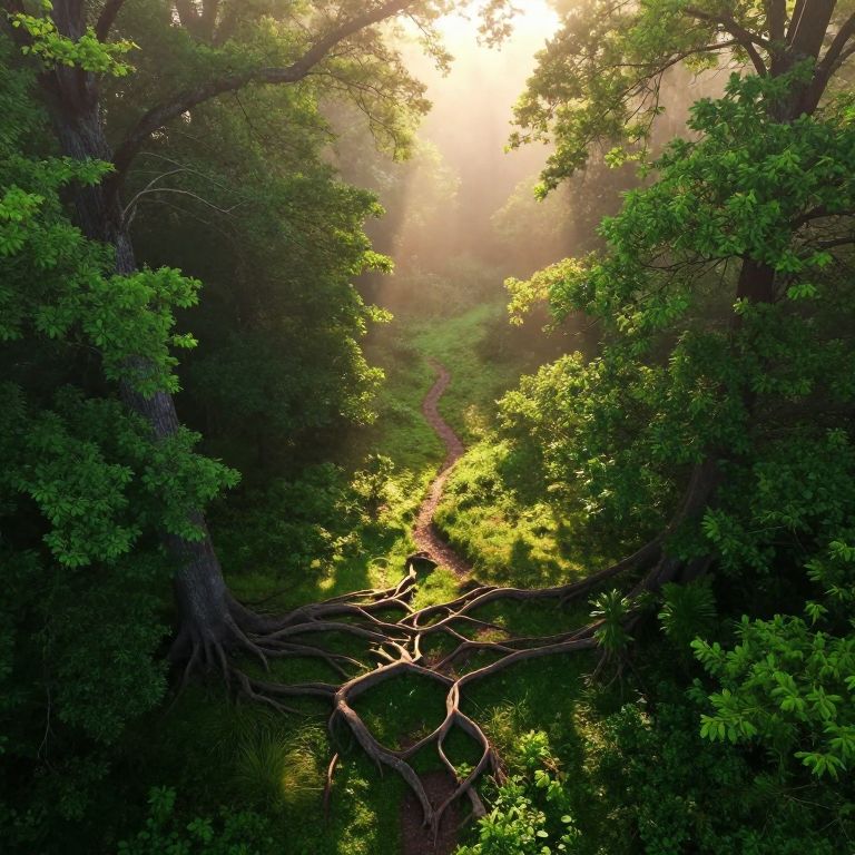Photograph of a lush forest scene at dawn. Sunlight filters through dense, vibrant green foliage, creating a radiant glow. A winding dirt path, bordered by large, intertwining tree roots, leads into the distance. The tree roots are dark brown and gnarled, contrasting with the bright green leaves. The light creates a misty effect in the background, enhancing the depth and serenity of the forest. The overall composition evokes a sense of tranquility and natural beauty. The sunlight highlights the texture of the leaves and roots, adding a dynamic interplay of light and shadow.