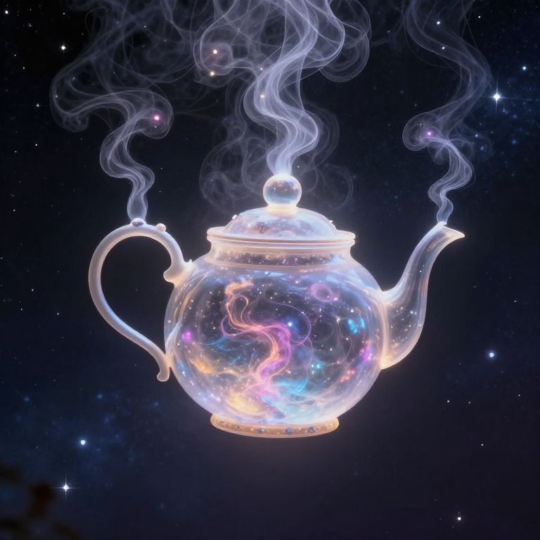 Glowing, transparent teapot with cosmic swirls inside, emitting wisps of smoke, floating in a starry night sky. Digital artwork.