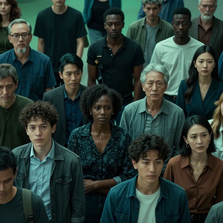 The image depicts a diverse group of people from various demographics, ages, genders, and races, all standing close together in a crowded space. The lighting is a mix of green and blue hues, creating a cool, somewhat somber atmosphere. The individuals are dressed in a variety of clothing styles, from casual to more formal attire, suggesting a range of professions and personal tastes. The people are arranged in a somewhat haphazard manner, with some individuals looking directly at the viewer while others are engaged in conversation or lost in thought. The overall composition is dynamic, with the figures overlapping and interacting in a way that creates a sense of depth and movement. The use of color and shading adds texture and dimension to the scene, making each person distinct yet part of a cohesive whole.