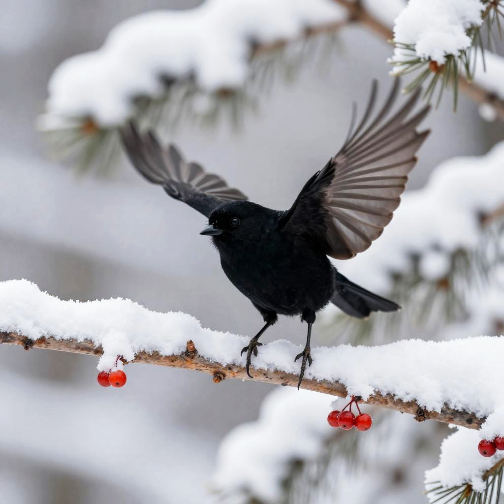 Wide shot, animal focus, bird, flying, in tree, branch, snow, snowflakes, snowy outdoors, winter, blurry background, depth of field, realistic, black eyes, beak, velvety midnight black, snowberry, pine tree