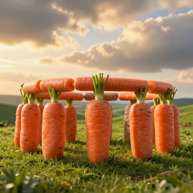 A stunning professional photograph of a miniature Stonehenge, meticulously crafted from vibrant, fresh carrots, The tall, upright carrot pillars are arranged in a perfect circle, with cross-beams made of shorter carrot pieces balanced on top, Each carrot displays intricate details, from the earthy texture of the skin to the green, leafy tops, The scene is set against a soft, natural backdrop of rolling green hills under a dramatic sky, with clouds casting a golden hue from the setting sun, The lighting highlights the vibrant orange of the carrots, contrasting beautifully with the natural landscape, The photo captures both the whimsy and artistry of this carrot Stonehenge, blending playful creativity with the timeless mystery of the ancient monument