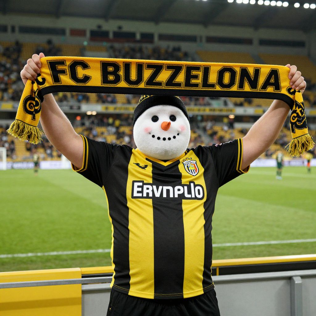 Fat and obese, snowman with a carrot nose is a football supporter hooligan, wearing a black and yellow team jersey, presenting a supporter scarf that says ”FC BUZZELONA”, The setting is the stands at a football stadium