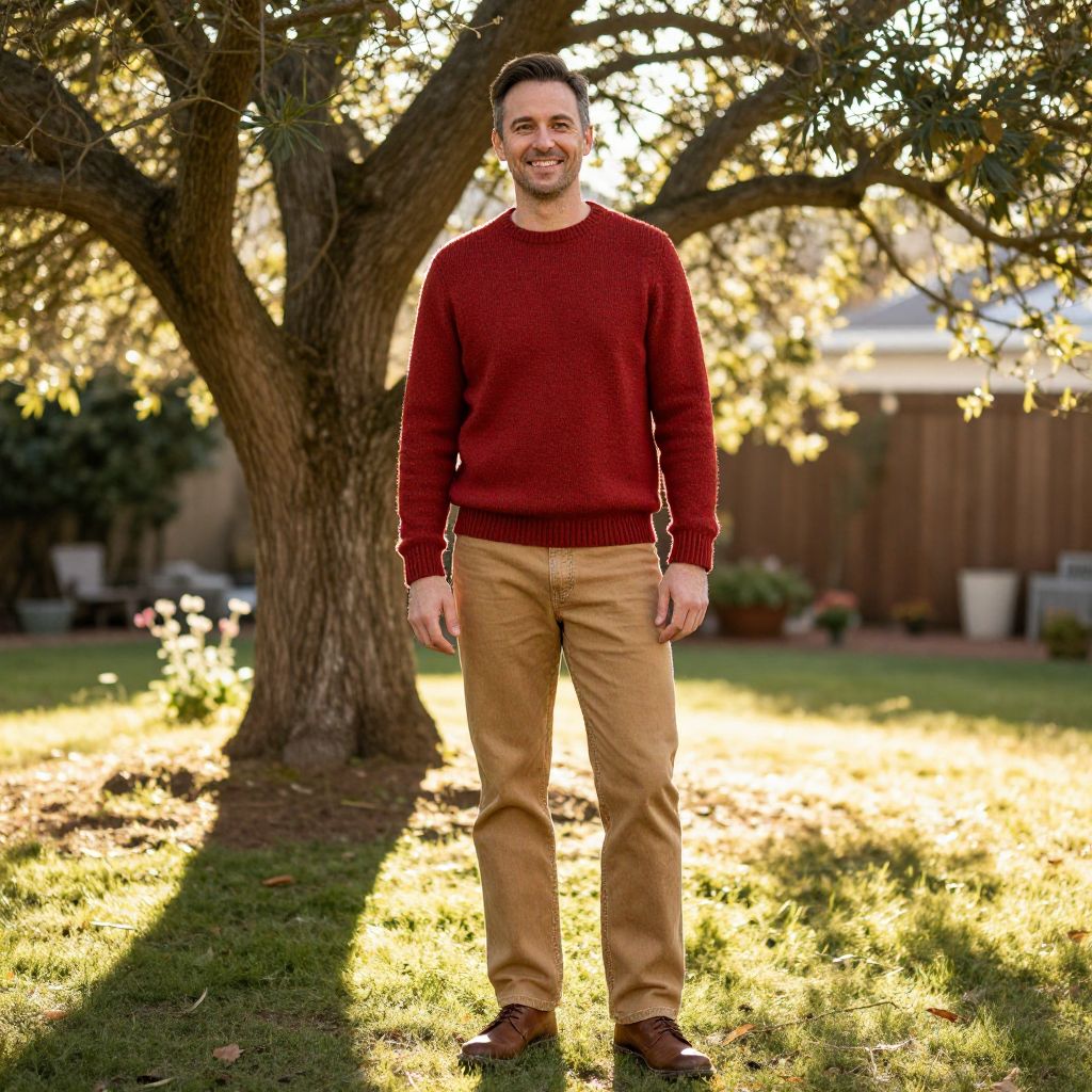 A man, khaki dress pants, striped long-sleeve shirt, burgundy v-neck sweater, dark brown brogues, standing in a sprawling concrete expanse, disposable camera style, relaxed expression, soft focus, warm tones. Man has masculine face and piercing eyes