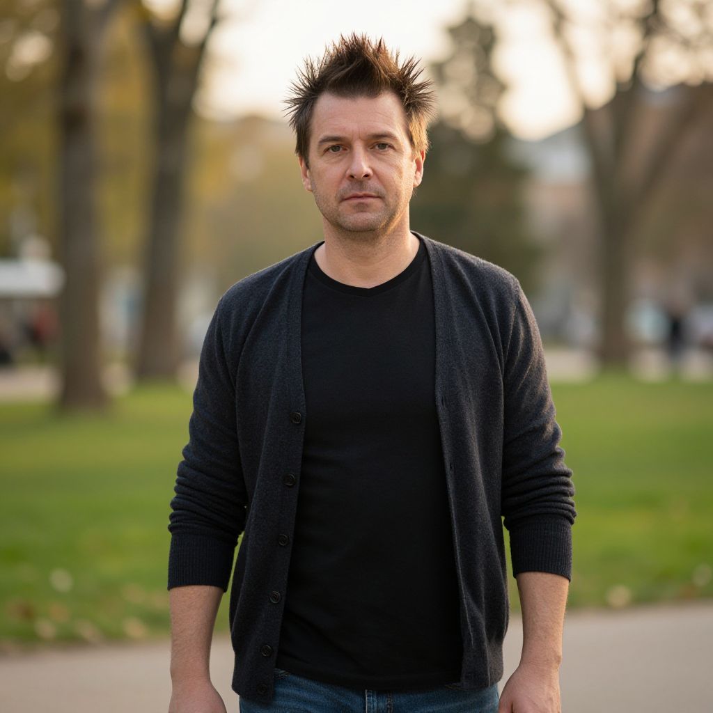 Red Highlights, fit european man, standing confidently in a city plaza, urban backdrop, natural lighting, stylish urban fashion, 45 years old, realistic photography style