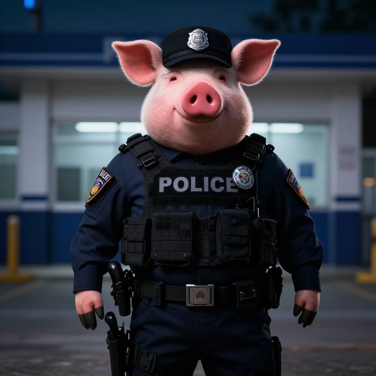 A digital CGI image features a pig with a pink face and large ears, dressed in a black police uniform. The uniform includes a badge on the hat, "POLICE" in bold letters on the chest, and various tactical gear. The pig stands in front of a blurred, nighttime police station with blue and white walls and illuminated windows. The pig's expression is neutral, and its black-gloved hands hang by its sides. The overall style is realistic with a slight cartoonish touch, emphasizing the humorous juxtaposition of a pig in police attire.