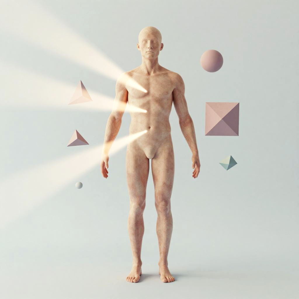 Body image creator theme, an abstract visualization of a person designing the human body structure using floating geometrical shapes and light beams, surreal art style, soft pastel palette, dreamlike atmosphere