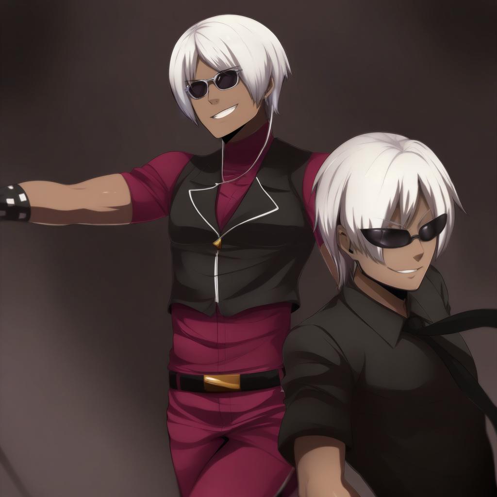 K' (kof), the king of fighters, 1boy, dark-skinned male, white hair, sunglasses, by artist dannex009, leet